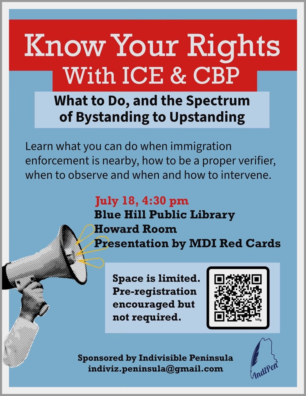 On July 14, 2025, we sponsored a presentation by MDI Red Cards at the Blue Hill Public Library. Kayla Gagnon and Alexa Kelly told us how to support our neighbors when ICE shows up and what our and their legal rights are, regardless of whether they are documented or or not.