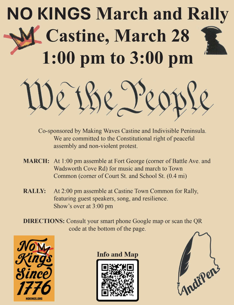 On March 28, 2026, Castine's Making Waves and Indivisible Peninsula organized a march and rally to say No Kings in America.