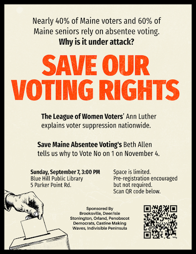 On September 7, 2025, we hosted Ann Luther of the League of Women Voters and Beth Allen of Save Miane Absentee Voting at the Blue Hill Public Library.